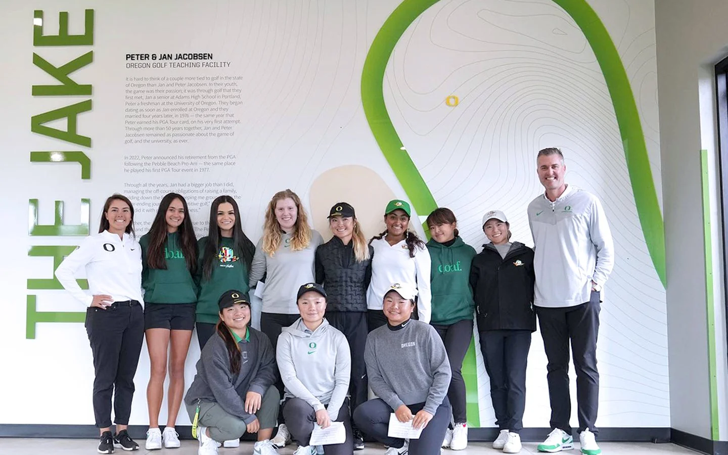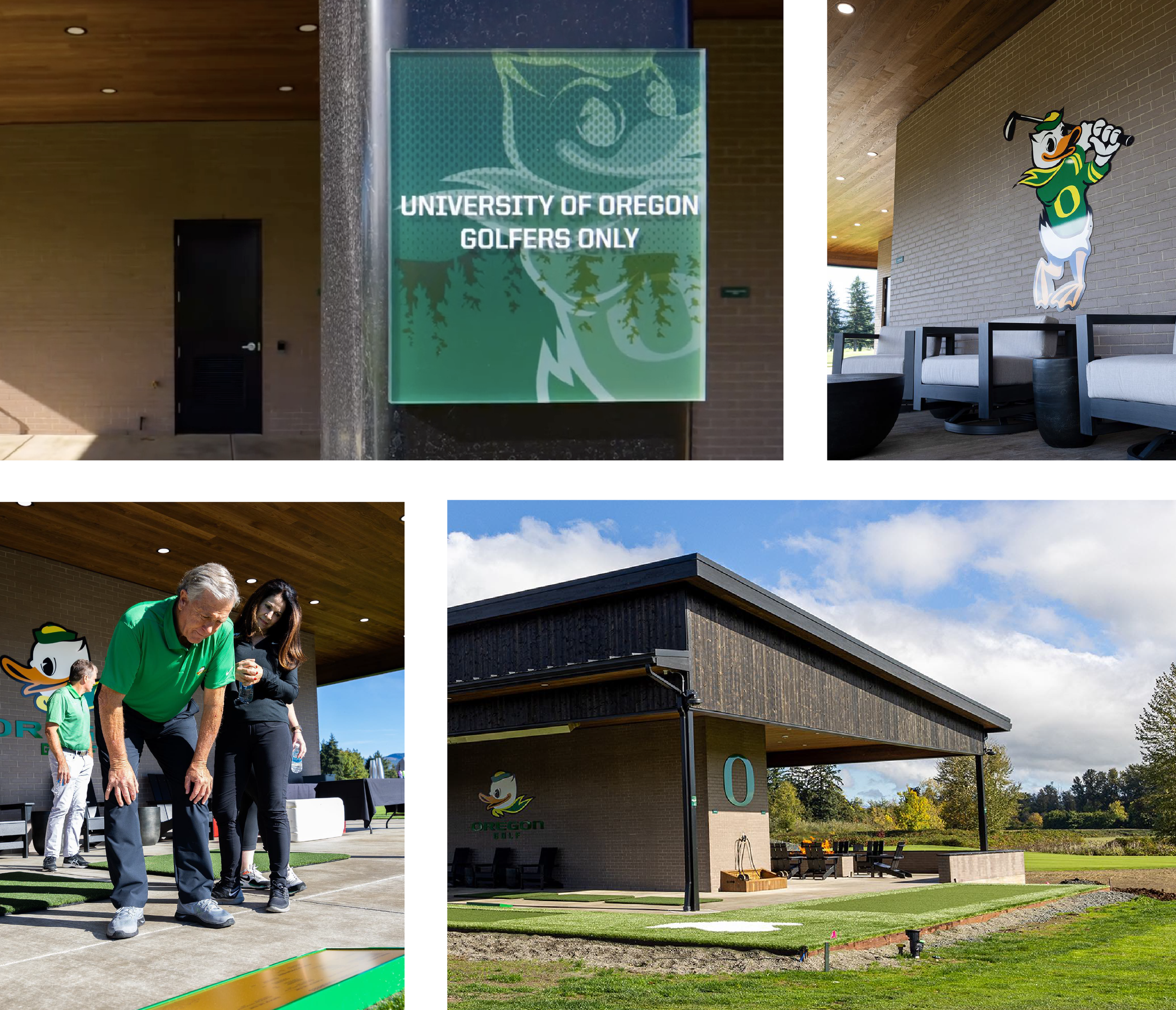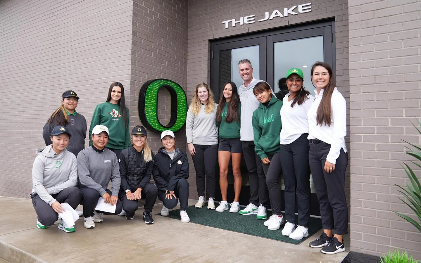 The Peter & Jan Jacobsen Oregon Golf Teaching Facility, nicknamed “The Jake”, honors retired pro Peter Jacobsen and his wife Jan, both former UO golfers. The Jake sits on a nearby golf course and features a student clubhouse, swing bays with performance analysis, and indoor putting greens.